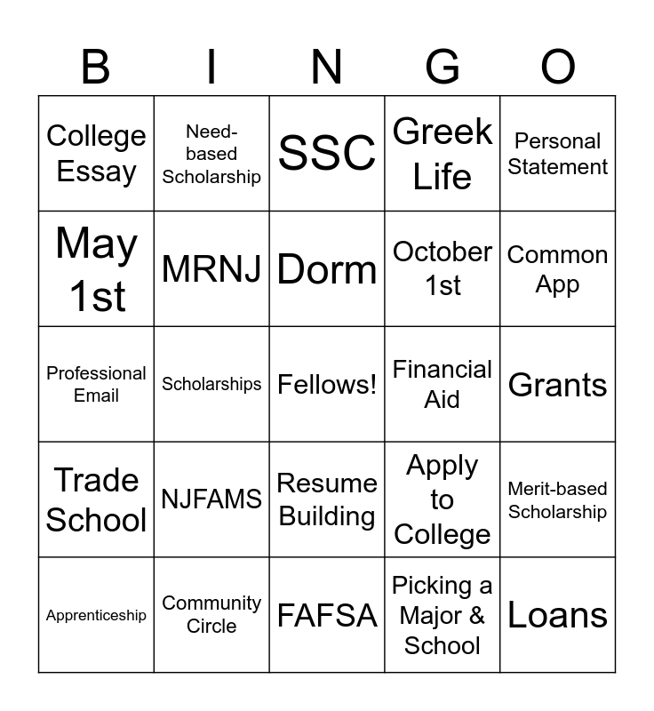 This bingo card has a free space and 31 words: FAFSA, HESAA, Scholarships, Imposter Syndrome, College Essay, SSC, MRNJ, Apply to College, Financial Aid, Picking a Major & School, Grants, Loans, Work Study, YPP, Common App, SAT & ACT, Merit-based Scholarship, NJFAMS, Trade School, Resume Building, Personal Statement, Letter of Rec, Apprenticeship, Need-based Scholarship, October 1st, May 1st, Greek Life, Professional Email, Community Circle, Dorm and Wheel Of Interests.