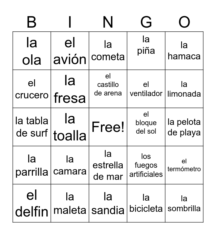 This bingo card has a free space and 46 words: la piscina, la sombrilla, las gafas de sol, la sandia, la camara, el girasol, el avión, el buceador, el crucero, el mosquito, la fresa, la piña, el termómetro, los fuegos artificiales, el parque acuático, el vehiculo recreativo, el castillo de arena, el bloque del sol, el cubo, la hamaca, la toalla, la bicicleta, la ola, el ventilador, el velero, la limonada, el delfin, la postal, la estrella de mar, la parrilla, la palmera, el traje de baño, la gaviota, las chanclas, el sol, la maleta, la pelota de playa, la canasta de picnic, el sombrero, la tumbona, el coco, la cometa, la tabla de surf, la paleta, el cangrejo and el helado.