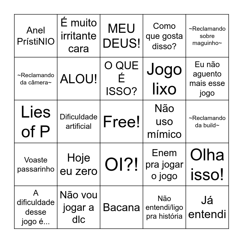 This bingo card has a free space and 24 words: Hoje eu zero, Não vou jogar a dlc, O QUE É ISSO?, A dificuldade desse jogo é..., ~Reclamando sobre maguinho~, Anel PrístiNIO, ~Reclamando da câmera~, É muito irritante cara, Não uso mímico, OI?!, Jogo lixo, Lies of P, Enem pra jogar o jogo, Olha isso!, ALOU!, Não entendi/ligo pra história, ~Reclamando da build~, MEU DEUS!, Eu não aguento mais esse jogo, Dificuldade artificial, Já entendi, Voaste passarinho, Como que gosta disso? and Bacana.