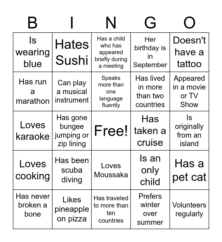 This bingo card has a free space and 24 words: Has been scuba diving, Likes pineapple on pizza, Speaks more than one language fluently, Has never broken a bone, Doesn't have a tattoo, Is wearing blue, Has run a marathon, Hates Sushi, Has taken a cruise, Loves Moussaka, Has lived in more than two countries, Loves karaoke, Is an only child, Has a pet cat, Can play a musical instrument, Prefers winter over summer, Is originally from an island, Has a child who has appeared briefly during a meeting, Appeared in a movie or TV Show, Has gone bungee jumping or zip lining, Volunteers regularly, Loves cooking, Her birthday is in September and Has traveled to more than ten countries.