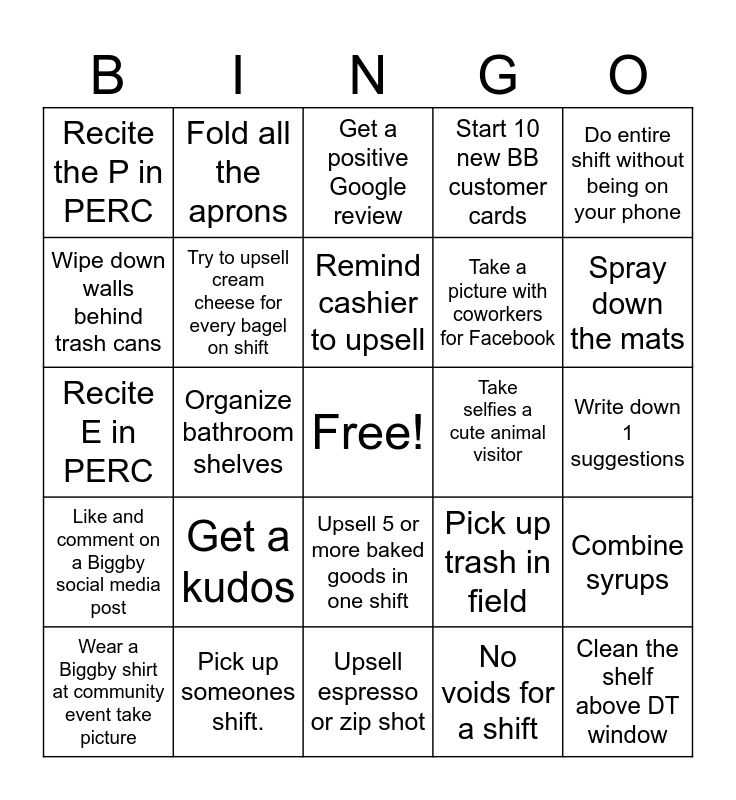 This bingo card has a free space and 24 words: Get a kudos, Pick up someones shift., Remind cashier to upsell, Wear a Biggby shirt at community event take picture, Do entire shift without being on your phone, Recite the P in PERC, Wipe down walls behind trash cans, Fold all the aprons, Take selfies a cute animal visitor, Upsell 5 or more baked goods in one shift, Take a picture with coworkers for Facebook, Recite E in PERC, Pick up trash in field, Combine syrups, Try to upsell cream cheese for every bagel on shift, No voids for a shift, Write down 1 suggestions, Get a positive Google review, Spray down the mats, Organize bathroom shelves, Clean the shelf above DT window, Like and comment on a Biggby social media post, Start 10 new BB customer cards and Upsell espresso or zip shot.