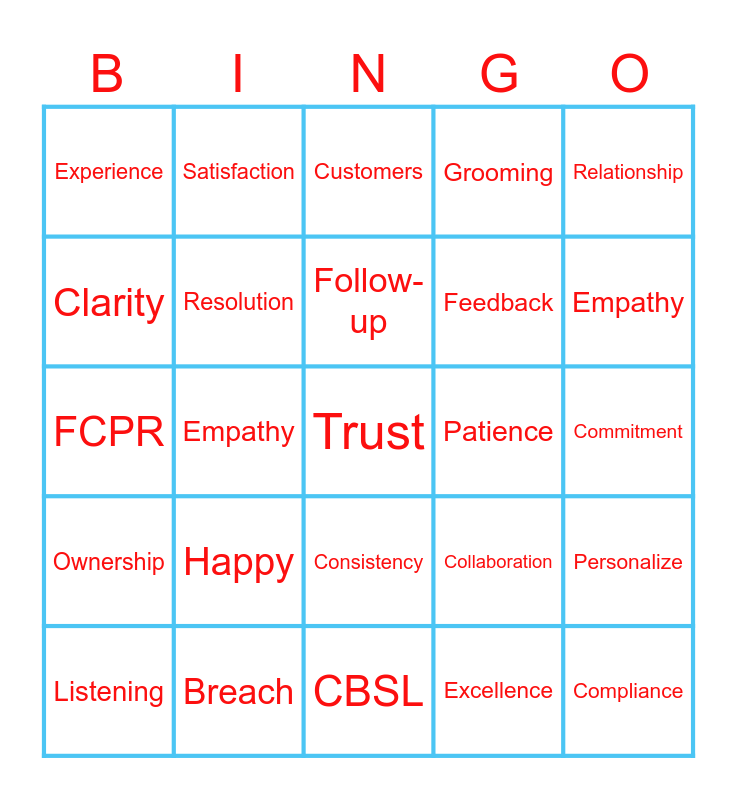 This bingo card has 30 words: Breach, TAT, Empathy, FCRD, Experience, Customers, Resolution, Consistency, Patience, CBSL, Commitment, Trust, Excellence, Compliance, Empathy, Service, Collaboration, Ownership, Happy, Relationship, FCPR, Complaint, Satisfaction, Feedback, Clarity, Grooming, Personalize, Listening, Follow-up and Delight.