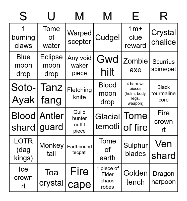 This bingo card has 36 words: Tome of earth, Earthbound tecpatl, 1 piece of Elder chaos robes, Blue moon drop, Blood shard, Blood moon drop, Eclipse moon drop, Fire cape, 1m+ clue reward, Sulphur blades, Scurrius spine/pet, Cudgel, Ven shard, Tanz fang, Gwd hilt, 1 burning claws, LOTR (dag kings), 4 barrows pieces (helm, body, legs, weapon), Soto-Ayak, Warped scepter, Fletching knife, Antler guard, Glacial temotli, Guild hunter outfit piece, Tome of fire, Tome of water, Zombie axe, Toa crystal, Any void waker piece, Crystal chalice, Dragon harpoon, Ice crown rt, Fire crown rt, Black tourmaline core, Monkey tail and Golden tench.