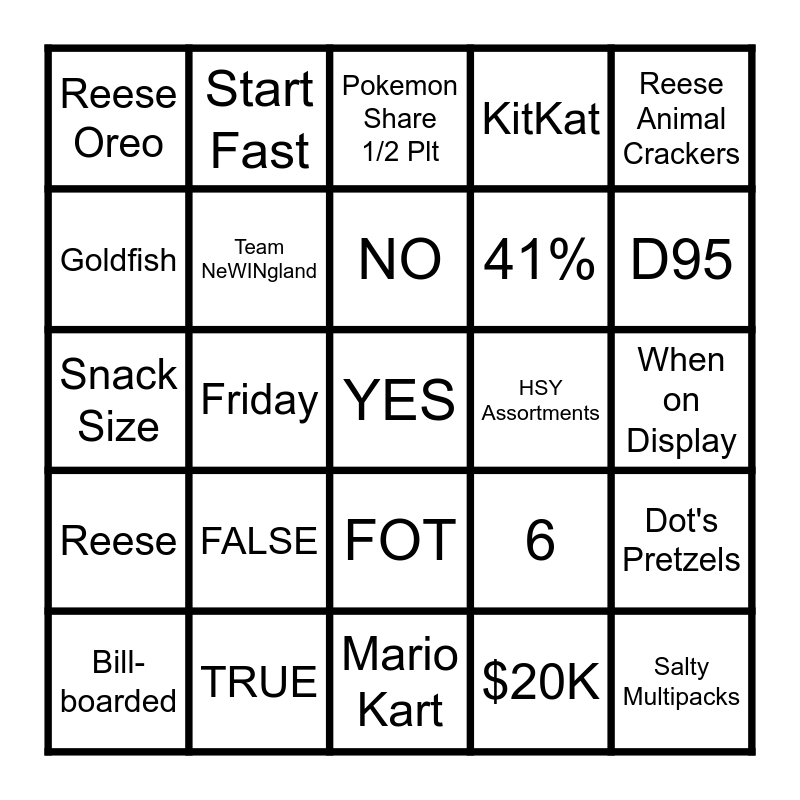 This bingo card has 30 words: Bill-boarded, ICE (AR/IR), NO, 89%, Reese Animal Crackers, Reese Oreo, Start Fast, FOT, HSY Assortments, Salty Multipacks, Reese, Team NeWINgland, EVD Party EC, $20K, Dot's Pretzels, Moranis, Friday, YES, 6, D95, Snack Size, TRUE, Pokemon Share 1/2 Plt, 41%, When on Display, Goldfish, FALSE, Mario Kart, KitKat and D82.