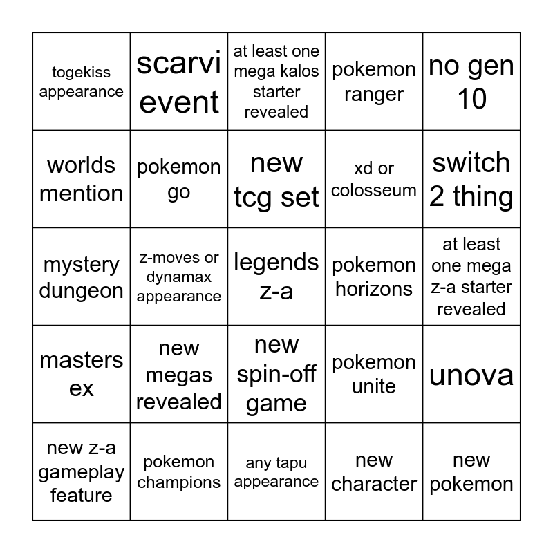 This bingo card has a free space and 24 words: new megas revealed, pokemon champions, new tcg set, new z-a gameplay feature, no gen 10, togekiss appearance, worlds mention, scarvi event, pokemon horizons, new spin-off game, xd or colosseum, mystery dungeon, pokemon unite, unova, pokemon go, new character, at least one mega z-a starter revealed, at least one mega kalos starter revealed, switch 2 thing, z-moves or dynamax appearance, new pokemon, masters ex, pokemon ranger and any tapu appearance.