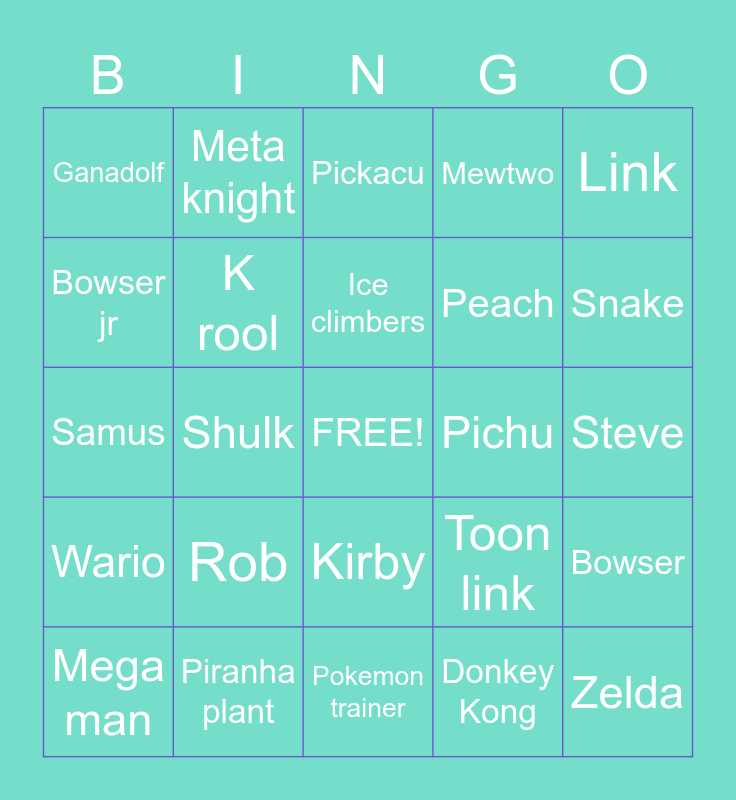 This bingo card has a free space and 24 words: Mega man, Rob, Ice climbers, Donkey Kong, Link, Ganadolf, Meta knight, Pickacu, Pichu, Steve, Samus, K rool, Toon link, Bowser, Bowser jr, Piranha plant, Pokemon trainer, Mewtwo, Snake, Wario, Shulk, Kirby, Peach and Zelda.