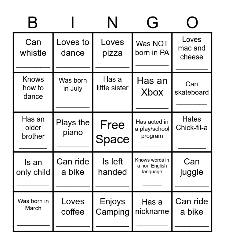 This bingo card has a free space and 32 words: Has a nickname _______, Is wearing jeans ________, Plays the piano _______, Has a dog _______, Is an only child _______, Was born in July _________, Loves mac and cheese ________, Can juggle _______, Loves to dance _______, Hates pizza _______, Has a little sister ________, Loves pizza _______, Plays baseball ________, Can whistle _______, Has acted in a play/school program _______, Was NOT born in Kansas. ________, Was born in March __________, Has an older brother _______, Is left handed _______, Can ride a bike _______, Knows words in a non-English language _______, Plays soccer _______, Hates Chick-fil-a _______, Loves coffee _______, Can ride a bike _______, Was NOT born in PA ________, Has an Xbox ______, Knows how to dance _______, Can whistle _______, Enjoys Camping _______, Has a nickname _______ and Can skateboard ________.