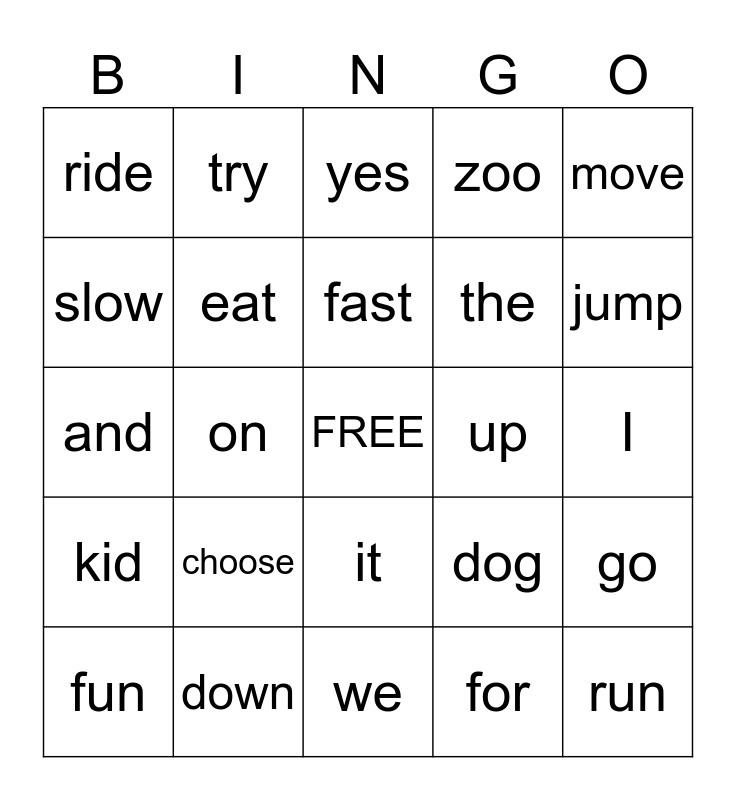 This bingo card has a free space and 24 words: choose, down, fast, fun, move, ride, slow, try, up, it, the, and, dog, go, eat, for, I, yes, jump, on, run, kid, zoo and we.