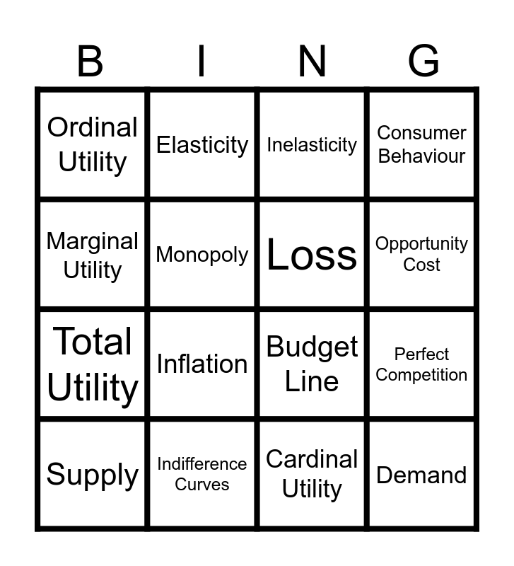 This bingo card has 18 words: Marginal Utility, Indifference Curves, Inelasticity, Consumer Behaviour, Total Utility, Elasticity, Budget Line, Opportunity Cost, Ordinal Utility, Inflation, Cardinal Utility, Perfect Competition, Supply, Monopoly, Loss, Demand, Cost and Profit.