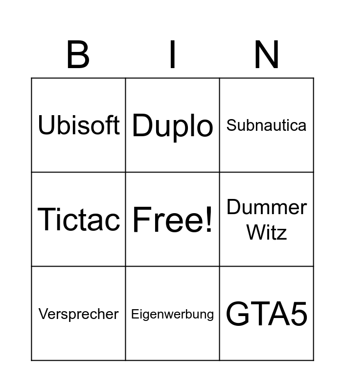 This bingo card has a free space and 9 words: Versprecher, Subnautica, Duplo, Tictac, Ubisoft, Dummer Witz, GTA5, Nintendo and Eigenwerbung.