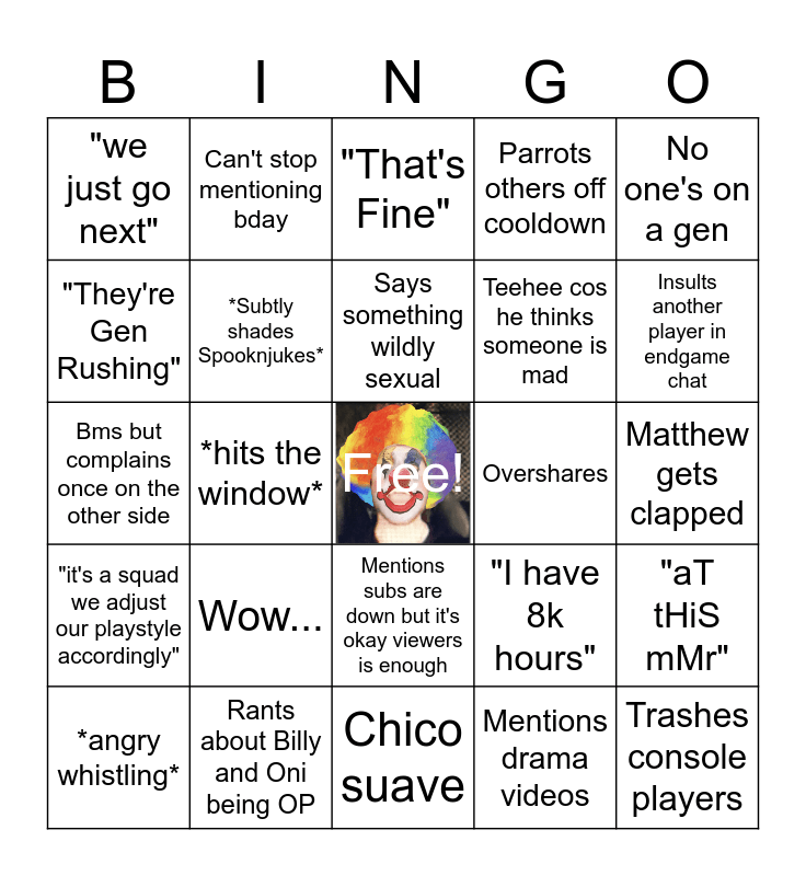 This bingo card has a free space and 24 words: Wow..., Rants about Billy and Oni being OP, Says something wildly sexual, *angry whistling*, No one's on a gen, "we just go next", "They're Gen Rushing", Can't stop mentioning bday, Overshares, Mentions subs are down but it's okay viewers is enough, Teehee cos he thinks someone is mad, Bms but complains once on the other side, "I have 8k hours", "aT tHiS mMr", *Subtly shades Spooknjukes*, Mentions drama videos, Matthew gets clapped, "That's Fine", Insults another player in endgame chat, *hits the window*, Trashes console players, "it's a squad we adjust our playstyle accordingly", Parrots others off cooldown and Chico suave.