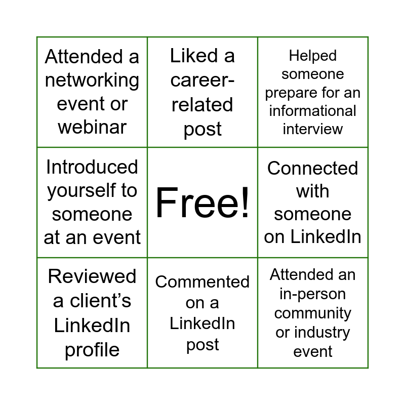 This bingo card has a free space and 8 words: Connected with someone on LinkedIn, Helped someone prepare for an informational interview, Liked a career-related post, Reviewed a client’s LinkedIn profile, Attended a networking event or webinar, Attended an in-person community or industry event, Introduced yourself to someone at an event and Commented on a LinkedIn post.