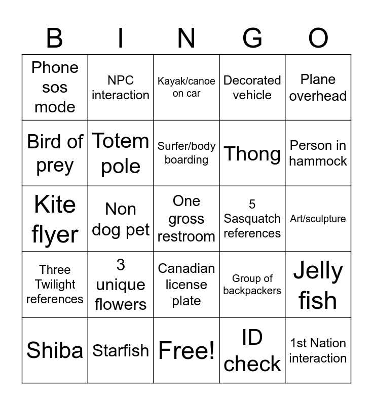This bingo card has 25 words: Three Twilight references, Starfish, One gross restroom, ID check, Plane overhead, Phone sos mode, NPC interaction, Kayak/canoe on car, 5 Sasquatch references, Jelly fish, Bird of prey, Totem pole, Free!, Group of backpackers, Person in hammock, Shiba, Non dog pet, Surfer/body boarding, Thong, Art/sculpture, Kite flyer, 3 unique flowers, Canadian license plate, Decorated vehicle and 1st Nation interaction.