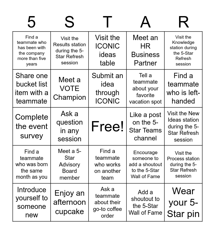 This bingo card has a free space and 32 words: Add a shoutout to the 5-Star Wall of Fame, Pick up your copy of Unreasonable Hospitality, Ask a question in any session, Find a teammate who has a pet photo as their phone wallpaper, Find a teammate who was born the same month as you, Meet a VOTE Champion, Visit the Knowledge station during the 5-Star Refresh session, Visit the Process station during the 5-Star Refresh session, Visit the Results station during the 5-Star Refresh session, Visit the Technology station during the 5-Star Refresh session, Submit an idea through ICONIC, Visit the ICONIC ideas table, Take a picture with Mandi, Post in the 5-Star Teams channel, Like a post on the 5-Star Teams channel, Share an example of a 5-Star customer experience, Introduce yourself to someone new, Complete the event survey, Find a teammate who works on another team, Meet a 5-Star Advisory Board member, Encourage someone to add a shoutout to the 5-Star Wall of Fame, Visit the Center of the Star station during the 5-Star Refresh session, Visit the New Ideas station during the 5-Star Refresh session, Enjoy an afternoon cupcake, Wear your 5-Star pin, Meet an HR Business Partner, Tell a teammate about your favorite vacation spot, Share one bucket list item with a teammate, Find a teammate who has been with the company more than five years, Ask a teammate about their go-to coffee order, Share your top three bingeworthy TV shows with a teammate and Find a teammate who is left-handed.