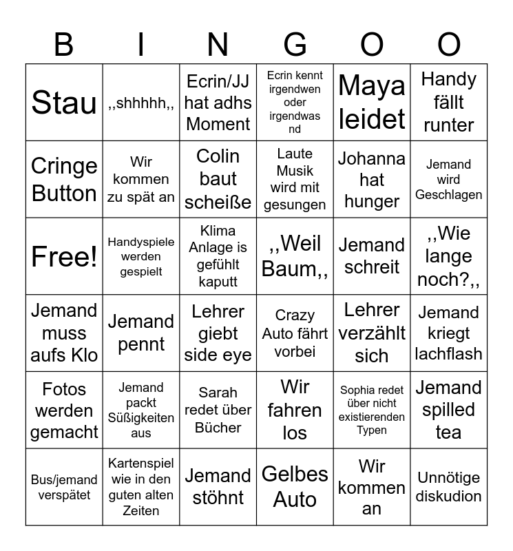 This bingo card has 36 words: Wir fahren los, Sarah redet über Bücher, Gelbes Auto, Cringe Button, Jemand muss aufs Klo, ,,Weil Baum,,, Wir kommen zu spät an, Jemand stöhnt, Maya leidet, Sophia redet über nicht existierenden Typen, Jemand wird Geschlagen, Ecrin kennt irgendwen oder irgendwas nd, Jemand spilled tea, Handyspiele werden gespielt, Laute Musik wird mit gesungen, Stau, Fotos werden gemacht, Jemand schreit, Free!, Ecrin/JJ hat adhs Moment, Klima Anlage is gefühlt kaputt, Jemand pennt, Crazy Auto fährt vorbei, Lehrer giebt side eye, Lehrer verzählt sich, ,,shhhhh,,, Johanna hat hunger, Kartenspiel wie in den guten alten Zeiten, Colin baut scheiße, Handy fällt runter, Unnötige diskudion, Bus/jemand verspätet, Jemand kriegt lachflash, ,,Wie lange noch?,,, Jemand packt Süßigkeiten aus and Wir kommen an.
