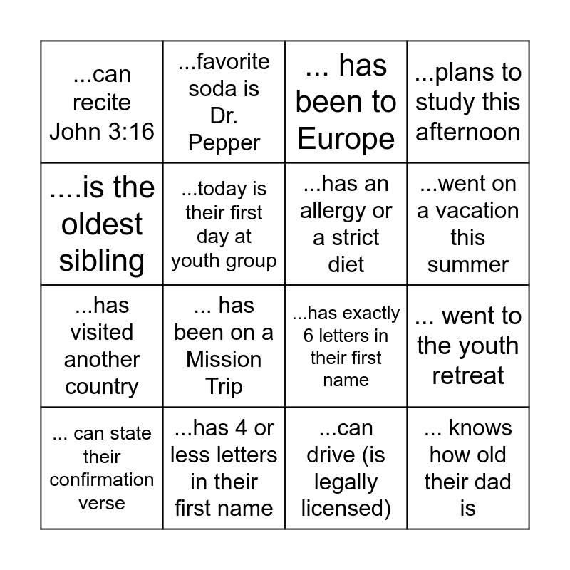 This bingo card has 25 words: ..has been to the Grand Canyon, ...plays a sport, ...went on a vacation this summer, ...prefers cheese pizza, ....is the oldest sibling, ...can recite John 3:16, ...today is their first day at youth group, ...favorite soda is Dr. Pepper, ...has 4 or less letters in their first name, ....who has been on a mission trip, ...has visited another country, ...has exactly 6 letters in their first name, ...has read the entire Bible, ...went to the youth retreat, ...has an allergy or a strict diet, ...cannot drive yet, ...can drive (is legally licensed), ... has been to Europe, ... has been on a Mission Trip, ... went to the youth retreat, ... can state their confirmation verse, ... knows their Mom's birthday, ... knows how old their dad is, ...plans to study this afternoon and ...knows and accepts Jesus as their Savior.