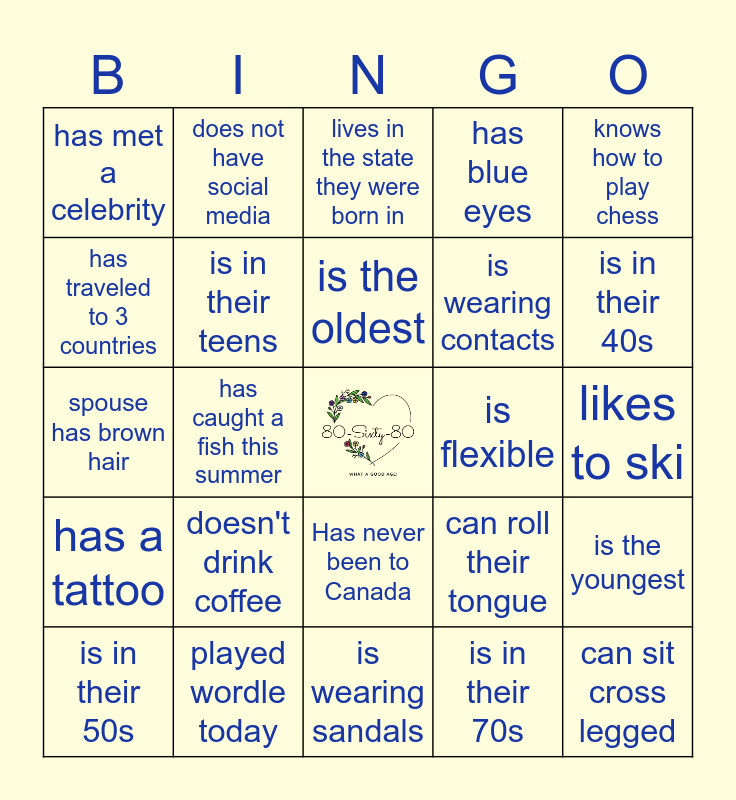This bingo card has a free space and 64 words: has a food allergy, plays a musical instrument, is wearing something blue, is the youngest, wears glasses, speaks another language, does not have social media, owns a boat, is the oldest, was born in march, Has never been to Canada, played a sport in school, likes to ski, knows how to play chess, can change a tire, has traveled to 3 countries, has caught a fish this summer, has met a celebrity, has never broken a bone, is wearing contacts, doesn't drink coffee, has a tattoo, has blue eyes, has been in a band, loves roller coasters, can do a headstand, has brown eyes, is the tallest, is on tik tok, had jack file their taxes, is wearing white, shares a name with an ancestor, is in their 20s, is in their 30s, is in their 40s, is in their 50s, is in their 60s, is in their 70s, is in their 80s, is in their teens, spouse has brown hair, is flexible, is musical, does not eat meat, is wearing socks, can sit cross legged, played wordle today, is wearing one purple, can roll their tongue, has the biggest hand, is wearing jewelry, has gray hair, is wearing sandals, has a collection with more than 20 items, has a car, has sewn on a button., lives in the state they were born in, owns a kite, was the driver to get here, hasn't been out of the country, has or had braces, has left the state in the last month, has more than 5 letters in their middle name and has played thruball.