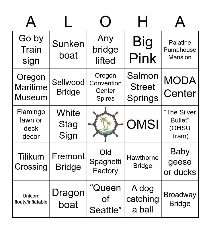 This bingo card has a free space and 36 words: Bald eagle, Blue heron, Ross Island Bridge, Sellwood Bridge, Hawthorne Bridge, Tilikum Crossing, Oregon Convention Center Spires, Willamette Falls, Palatine Pumphouse Mansion, Waverly Country Club, White Stag Sign, Big Pink, USS Blueback, OMSI, MODA Center, Go by Train sign, Steel Bridge, Fremont Bridge, Broadway Bridge, Any bridge lifted, “The Silver Bullet” (OHSU Tram), Baby geese or ducks, Dragon boat, Unicorn floaty/inflatable, “Queen of Seattle”, Sunken boat, Flamingo lawn or deck decor, Disco ball on a boat, Salmon Street Springs, Oregon Maritime Museum, Traffic jam on the Marquam Bridge, Oaks Amusement Park ride, A dog catching a ball, Old Spaghetti Factory, Someone wearing a lei and Stand-up paddle boarding.