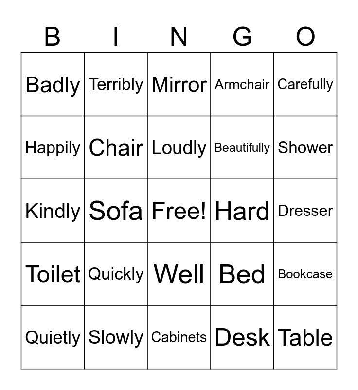 This bingo card has a free space and 24 words: Quickly, Slowly, Loudly, Quietly, Carefully, Badly, Happily, Terribly, Hard, Well, Beautifully, Kindly, Bed, Bookcase, Chair, Desk, Dresser, Mirror, Shower, Sofa, Table, Toilet, Armchair and Cabinets.