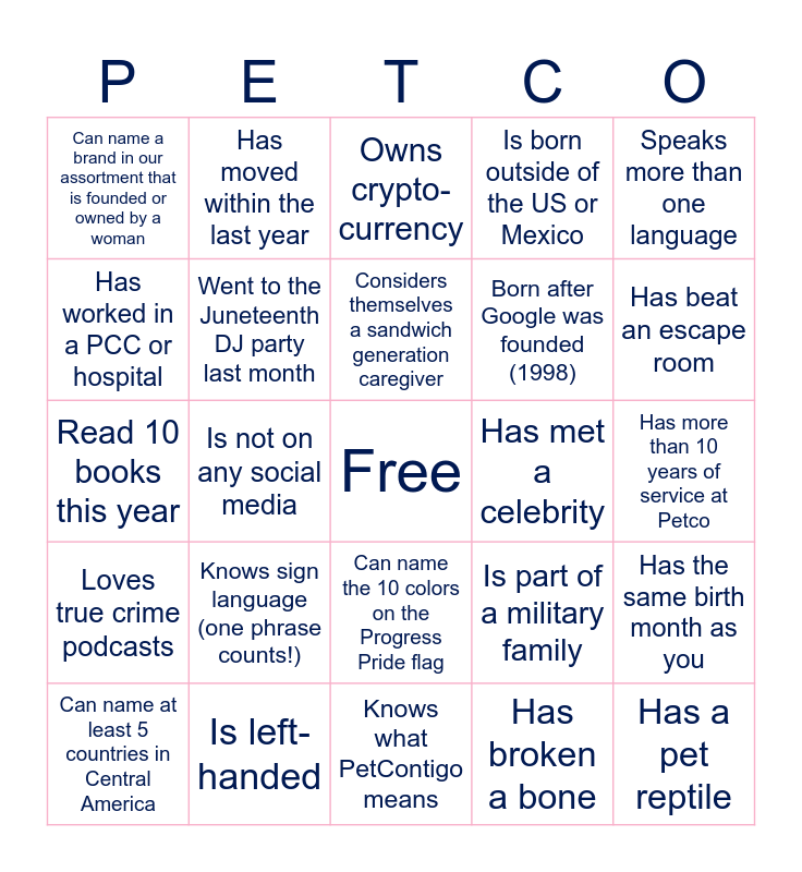 This bingo card has a free space and 24 words: Knows sign language (one phrase counts!), Is left-handed, Considers themselves a sandwich generation caregiver, Can name at least 5 countries in Central America, Speaks more than one language, Can name a brand in our assortment that is founded or owned by a woman, Has worked in a PCC or hospital, Has moved within the last year, Has met a celebrity, Can name the 10 colors on the Progress Pride flag, Born after Google was founded (1998), Read 10 books this year, Is part of a military family, Has the same birth month as you, Went to the Juneteenth DJ party last month, Has broken a bone, Has more than 10 years of service at Petco, Owns crypto-currency, Has beat an escape room, Is not on any social media, Has a pet reptile, Loves true crime podcasts, Is born outside of the US or Mexico and Knows what PetContigo means.