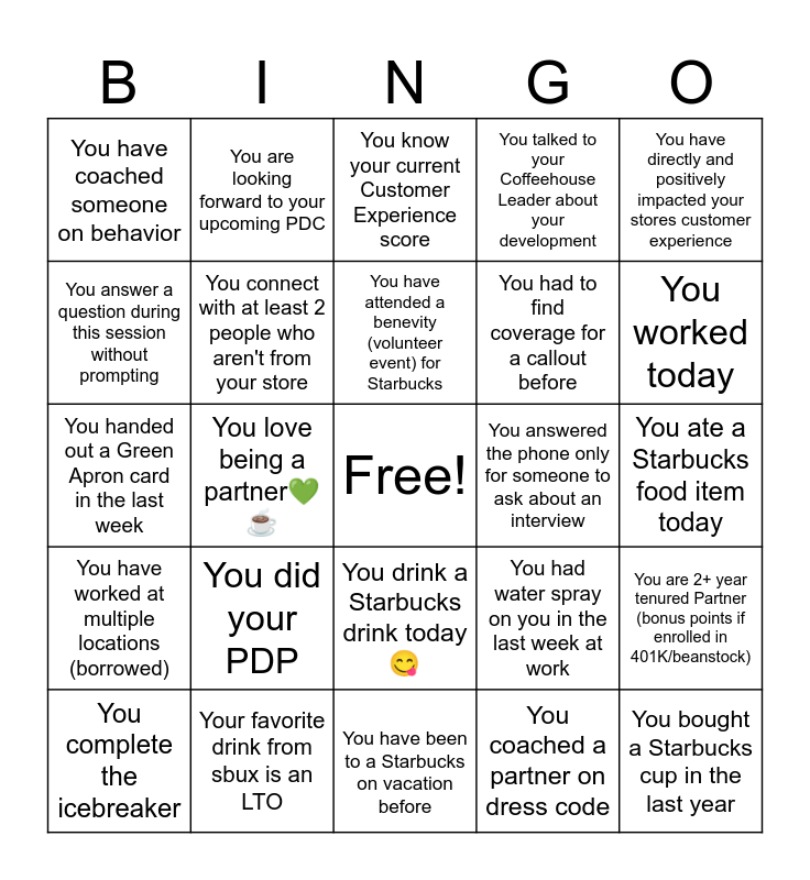 This bingo card has a free space and 24 words: You did your PDP, Your favorite drink from sbux is an LTO, You have attended a benevity (volunteer event) for Starbucks, You complete the icebreaker, You have directly and positively impacted your stores customer experience, You have coached someone on behavior, You answer a question during this session without prompting, You are looking forward to your upcoming PDC, You answered the phone only for someone to ask about an interview, You drink a Starbucks drink today😋, You had to find coverage for a callout before, You handed out a Green Apron card in the last week, You had water spray on you in the last week at work, You are 2+ year tenured Partner (bonus points if enrolled in 401K/beanstock), You connect with at least 2 people who aren't from your store, You coached a partner on dress code, You ate a Starbucks food item today, You know your current Customer Experience score, You worked today, You love being a partner💚☕️, You bought a Starbucks cup in the last year, You have worked at multiple locations (borrowed), You talked to your Coffeehouse Leader about your development and You have been to a Starbucks on vacation before.