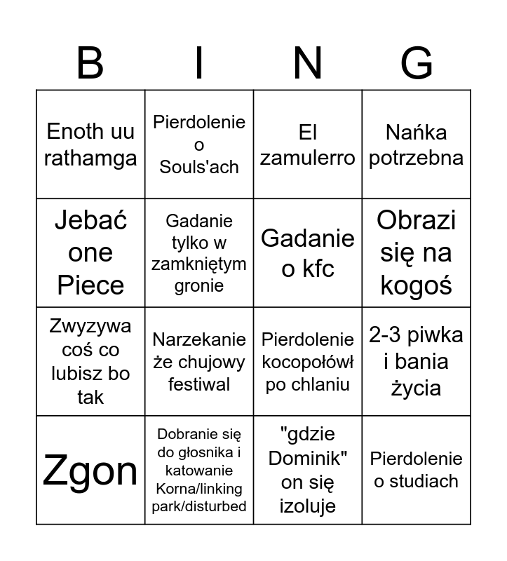 This bingo card has 20 words: 2-3 piwka i bania życia, Będzie płakać za Martą, El zamulerro, Daj peta, Zgon, Jebać one Piece, Dobranie się do głosnika i katowanie Korna/linking park/disturbed, Enoth uu rathamga, Zwyzywa coś co lubisz bo tak, Pierdolenie o Souls'ach, Narzekanie że chujowy festiwal, Pierdolenie kocopołówł po chlaniu, Gadanie tylko w zamkniętym gronie, Pierdolenie o studiach, Gadanie o kfc, Gejowe żarty, Obrazi się na kogoś, Nańka potrzebna, "gdzie Dominik" on się izoluje and Siądzie fajna rozmowa.