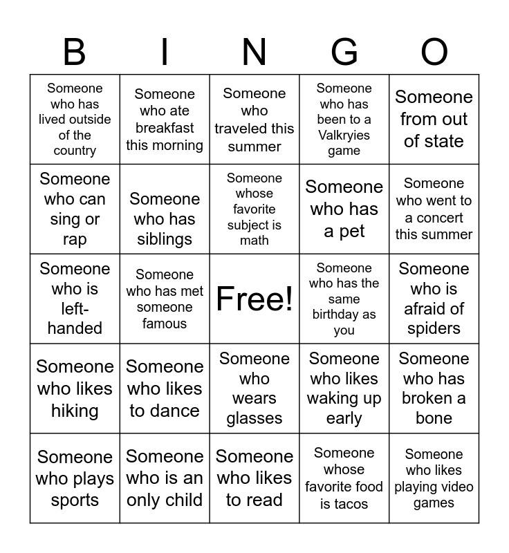 This bingo card has a free space and 24 words: Someone who likes to dance, Someone who is an only child, Someone whose favorite subject is math, Someone who plays sports, Someone from out of state, Someone who has lived outside of the country, Someone who can sing or rap, Someone who ate breakfast this morning, Someone who has the same birthday as you, Someone who wears glasses, Someone who has a pet, Someone who is left-handed, Someone who likes waking up early, Someone who has broken a bone, Someone who has siblings, Someone whose favorite food is tacos, Someone who is afraid of spiders, Someone who traveled this summer, Someone who went to a concert this summer, Someone who has met someone famous, Someone who likes playing video games, Someone who likes hiking, Someone who has been to a Valkryies game and Someone who likes to read.