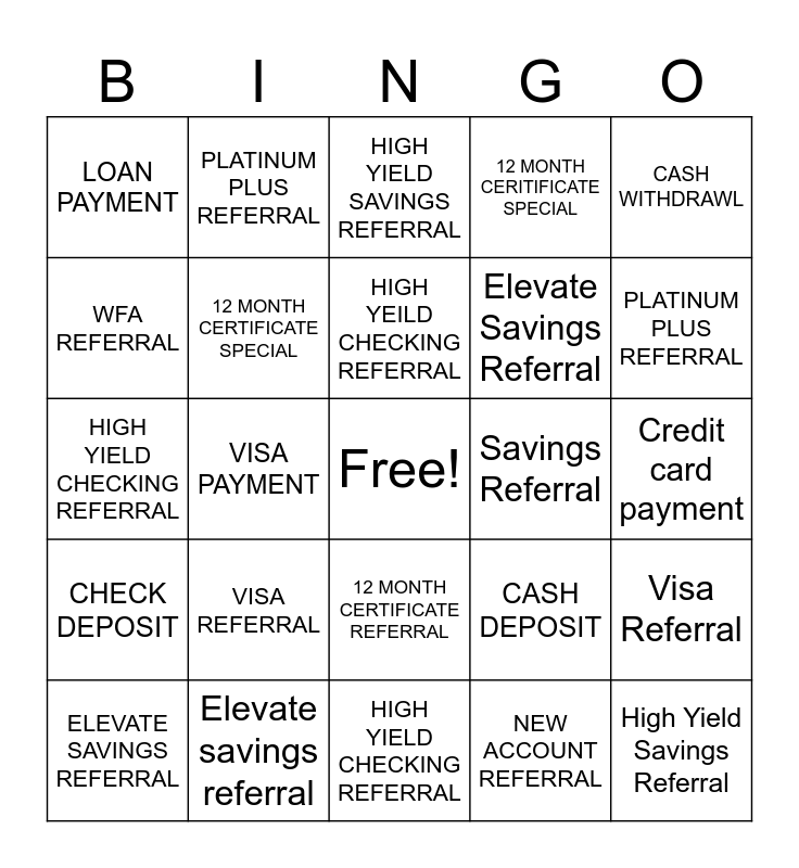 This bingo card has a free space and 24 words: VISA REFERRAL, Elevate savings referral, HIGH YEILD CHECKING REFERRAL, ELEVATE SAVINGS REFERRAL, CASH WITHDRAWL, LOAN PAYMENT, WFA REFERRAL, PLATINUM PLUS REFERRAL, Savings Referral, 12 MONTH CERTIFICATE REFERRAL, Elevate Savings Referral, HIGH YIELD CHECKING REFERRAL, CASH DEPOSIT, Visa Referral, 12 MONTH CERTIFICATE SPECIAL, NEW ACCOUNT REFERRAL, Credit card payment, HIGH YIELD SAVINGS REFERRAL, PLATINUM PLUS REFERRAL, VISA PAYMENT, High Yield Savings Referral, CHECK DEPOSIT, 12 MONTH CERITIFICATE SPECIAL and HIGH YIELD CHECKING REFERRAL.