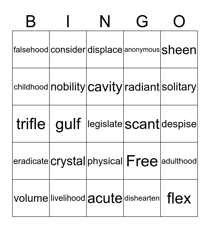 This bingo card has 25 words: crystal, acute, cavity, volume, sheen, falsehood, childhood, consider, scant, physical, radiant, trifle, Free, adulthood, nobility, flex, despise, displace, solitary, gulf, legislate, livelihood, eradicate, anonymous and dishearten.