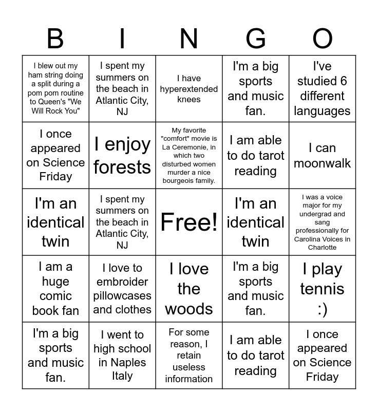 This bingo card has a free space and 29 words: I'm a big sports and music fan., My favorite "comfort" movie is La Ceremonie, in which two disturbed women murder a nice bourgeois family., I spent my summers on the beach in Atlantic City, NJ, I play tennis, I blew out my ham string doing a split during a pom pom routine to Queen's "We Will Rock You", I have hyperextended knees, I enjoy forests, I love to embroider pillowcases and clothes, I'm an identical twin, I went to high school in Naples Italy, I was a voice major for my undergrad and sang professionally for Carolina Voices in Charlotte, I once appeared on Science Friday, For some reason, I retain useless information, I am able to do tarot reading, I can moonwalk, I was an active in high school choir competitions, I love the woods, I am a huge comic book fan, I've studied 6 different languages, I'm an identical twin, I'm a big sports and music fan., I have hyperextended knees, I am able to do tarot reading, I once appeared on Science Friday, I'm a big sports and music fan., I spent my summers on the beach in Atlantic City, NJ, I play tennis :), My favorite "comfort" movie is La Ceremonie, in which two disturbed women murder a nice bourgeois family. and I blew out my ham string doing a split during a pom pom routine to Queen's "We Will Rock You".