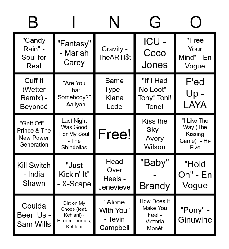 This bingo card has 1 images, a free space and 112 words: Snooze - SZA, On My Mama - Victoria Monét, Good Good (feat. Summer Walker & 21 Savage) - Usher, GLU - Usher, How We Roll (feat. Chris Brown) - Ciara, ICU - Coco Jones, Angel Numbers / Ten Toes - Chris Brown, Like That - Future, Metro Boomin, Kendrick Lamar, Water - Tyla, Favorite Song - Toosii, Paint The Town Red - Doja Cat, Burning Blue - Mariah the Scientist, Spend It - Summer Walker, Tony Soprano - Brent Faiyaz, Back of the Club - kwn, Head Over Heels - Jenevieve, Deus Deus - anaiis, FEEL SOMETHING - Sasha Keable, Luvhiii - CARI, Coulda Been Us - Sam Wills, Gravity - TheARTI$t, Talk About Us (feat. Isaiah Falls) - Emotional Oranges, Isaiah Falls, Everybody Gets Down - NxWorries, Knxwledge, Anderson .Paak, JIGGY - Spotify, Kill Switch - India Shawn, Dirt on My Shoes (feat. Kehlani) - ELeon Thomas, Kehlani, Dog Days - EOvrkast., Saba, Frsh Waters, Made For Me - Muni Long, Need 2 Know - LAYA, F'ed Up - LAYA, Same Type - Kiana Lede, Last Night Was Good For My Soul - The Shindellas, 2000's R&B (feat. RL) - Kenyon Dixon, Self Love - Queen Naija, Good on Me - Leela James, Victims & Villains - Musiq Soulchild, Show & Prove - Kevin Ross, All Night - Raheem DeVaughn, Juicy - The Shindellas, Don't Think You Ever Loved Me - Tyrese, I Need To Know - Ledisi, Cheat (feat. JoJo) - Mahalia, Good Soup - Jai'Len Josey, Look My Way - Kevin Ross, Good Bye - Victoria Monét, How Does It Make You Feel - Victoria Monét, Cuff It (Wetter Remix) - Beyoncé, Moonlight - Chris Brown, Serious - Omarion, That's You - Lucky Daye, Kiss the Sky - Avery Wilson, Between Love & War - Musiq Soulchild, I Like (feat. Mary J. Blige) - Diddy, Missin U (R&B Edit) - Tori Kelly, Aries (YuGo) - Janelle Monáe, "No Diggity" - BLACKstreet ft. Dr. Dre, "My Lovin' (You're Never Gonna Get It)" - En Vogue, "The Boy Is Mine" - Brandy & Monica, "Real Love" - Mary J. Blige, "Hold On" - En Vogue, "This Is How We Do It" - Montell Jordan, "Creep" - TLC, "You Make Me Wanna..." - Usher, "No, No, No Part II" - Destiny's Child ft. Wyclef Jean, "No Scrubs" - TLC, "Poison" - Bell Biv DeVoe, "Are You That Somebody?" - Aaliyah, "Gett Off" - Prince & The New Power Generation, "I Love Your Smile" - Shanice, "I Like The Way (The Kissing Game)" - Hi-Five, "Freak Like Me" - Adina Howard, "Remember the Time" - Michael Jackson, "Ain't 2 Proud 2 Beg" - TLC, "Motownphilly" - Boyz II Men, "Pony" - Ginuwine, "Just Kickin' It" - X-Scape, "Candy Rain" - Soul for Real, "Too Close" - Next, "Back and Forth" - Aaliyah, "Don't Walk Away" - Jade, "Fantasy" - Mariah Carey, "Don't Take It Personal (Just One of Dem Days)" - Monica, "Baby" - Brandy, "If I Had No Loot" - Tony! Toni! Tone!, "I'm So Into You" - SWV, "Dream Lover" - Mariah Carey, "Power of Love/Love Power" - Luther Vandross, "Unpretty" - TLC, "It Never Rains (In Southern California)" - Tony! Toni! Tone!, "The First Night" - Monica, "I'm Every Woman" - Whitney Houston, "Free Your Mind" - En Vogue, "Weak" - SWV, "I Wanna Be Your Man" - Charlie Wilson, "I'm Dreamin'" - Christopher Williams, "Can We Talk" - Tevin Campbell, "All My Life" - K-Ci & JoJo, "Sensitivity" - Ralph Tresvant, "Brown Sugar" - ED'Angelo, "Cheers 2 U" - E.I. (Positive K), "Bills, Bills, Bills" - Destiny's Child, "What's On Tonight" - Montell Jordan, "How Can I Ease the Pain" - Lisa Fischer, "Emotions" - Mariah Carey, "Body and Soul" - Anita Baker, "Alone With You" - Tevin Campbell, "It's So Hard To Say Goodbye To Yesterday" - Boyz II Men, "Freak Like Me" - Adina Howard, "Kiss of Life" - Sade, "Ascension (Don't Ever Wonder)" - Maxwell, "Love No Limit" - Mary J. Blige and "Lose Control" - Silk.