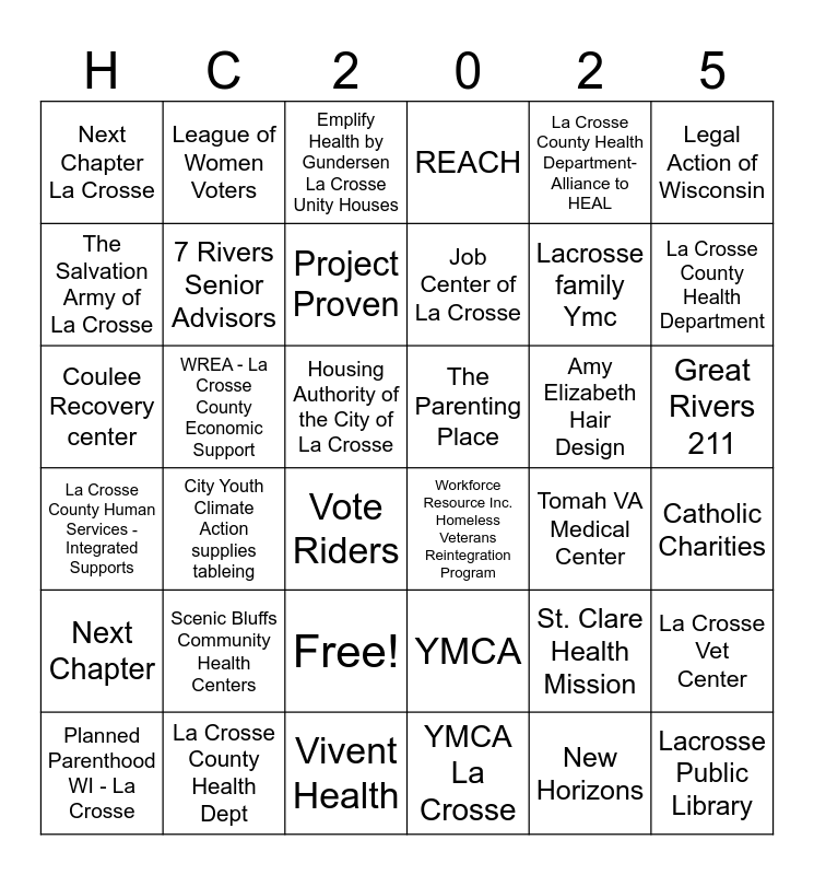 This bingo card has 42 words: New Horizons, 7 Rivers Senior Advisors, ADRC of La Crosse County, Amy Elizabeth Hair Design, Catholic Charities, City Youth Climate Action supplies tableing, Coulee Recovery center, Couleecap, Emplify Health by Gundersen La Crosse Unity Houses, Great Rivers 211, Housing Authority of the City of La Crosse, Job Center of La Crosse, La Crosse County Health Department, La Crosse County Health Department- Alliance to HEAL, La Crosse County Health Dept, La Crosse County Human Services - Integrated Supports, La Crosse Vet Center, Lacrosse family Ymc, Lacrosse Public Library, League of Women Voters, Legal Action of Wisconsin, Free!, Next Chapter, Next Chapter La Crosse, Next Steps for Change, Planned Parenthood WI - La Crosse, Project Proven, Safe Families for Children, Scenic Bluffs Community Health Centers, St. Clare Health Mission, Tammi Winters, The Parenting Place, The Salvation Army of La Crosse, Tomah VA Medical Center, Vivent Health, Vote Riders, Workforce Resource Inc. Homeless Veterans Reintegration Program, WREA - La Crosse County Economic Support, YMCA, YMCA La Crosse, REACH and YHDP/YAB.