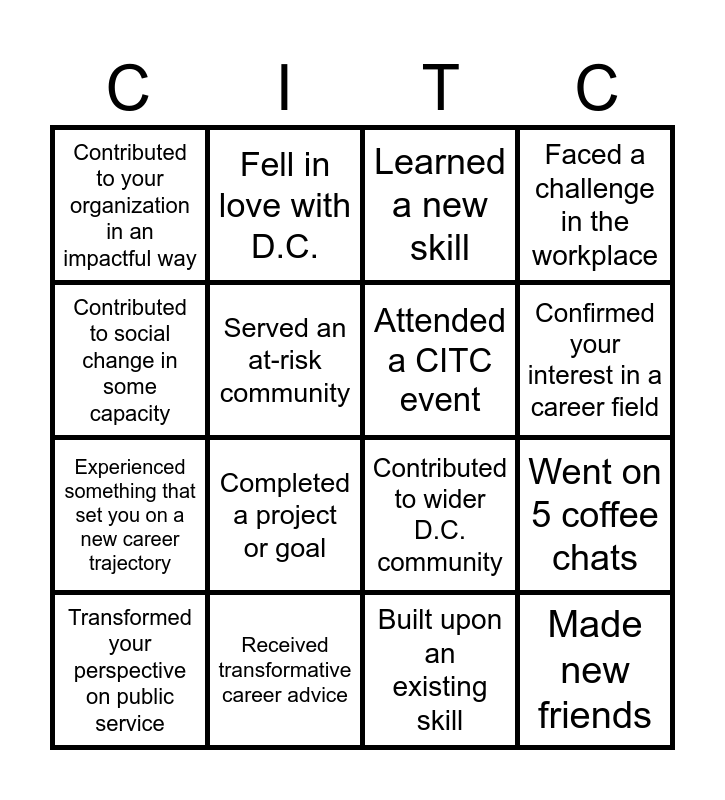 This bingo card has 16 words: Received transformative career advice, Went on 5 coffee chats, Learned a new skill, Contributed to your organization in an impactful way, Experienced something that set you on a new career trajectory, Fell in love with D.C., Contributed to wider D.C. community, Built upon an existing skill, Contributed to social change in some capacity, Served an at-risk community, Transformed your perspective on public service, Faced a challenge in the workplace, Completed a project or goal, Confirmed your interest in a career field, Attended a CITC event and Made new friends.