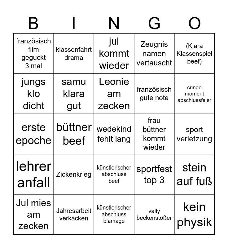 This bingo card has a free space and 24 words: Zickenkrieg, Jahresarbeit verkacken, Leonie am zecken, Jul mies am zecken, (Klara Klassenspiel beef), französisch film geguckt 3 mal, jungs klo dicht, klassenfahrt drama, frau büttner kommt wieder, künstlerischer abschluss beef, französisch gute note, erste epoche, sportfest top 3, stein auf fuß, samu klara gut, vally beckenstoßer, sport verletzung, jul kommt wieder, cringe moment abschlussfeier, büttner beef, kein physik, lehrer anfall, Zeugnis namen vertauscht and künstlerischer abschluss blamage.