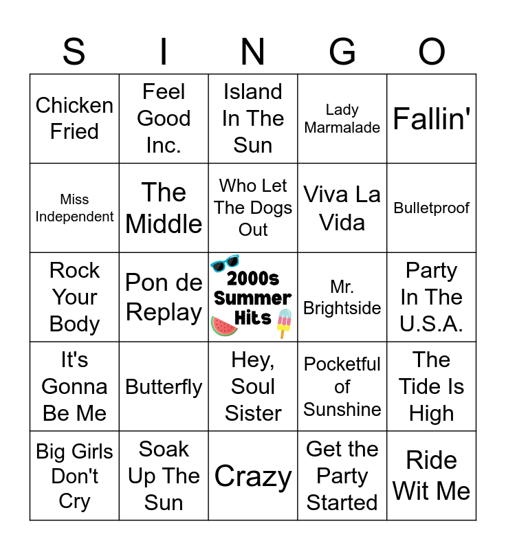This bingo card has a free space and 30 words: Soak Up The Sun, Maria Maria, Pon de Replay, Hey Ya!, Chicken Fried, Island In The Sun, The Middle, Hey, Soul Sister, Mr. Brightside, Crazy, Party In The U.S.A., Ride Wit Me, Get the Party Started, It Wasn't Me, Bulletproof, I Gotta Feeling, Pocketful of Sunshine, It's Gonna Be Me, Butterfly, Fallin', Rock Your Body, Oops!...I Did It Again, Feel Good Inc., Viva La Vida, Miss Independent, Lady Marmalade, The Tide Is High, Big Girls Don't Cry, Who Let The Dogs Out and Use Somebody.