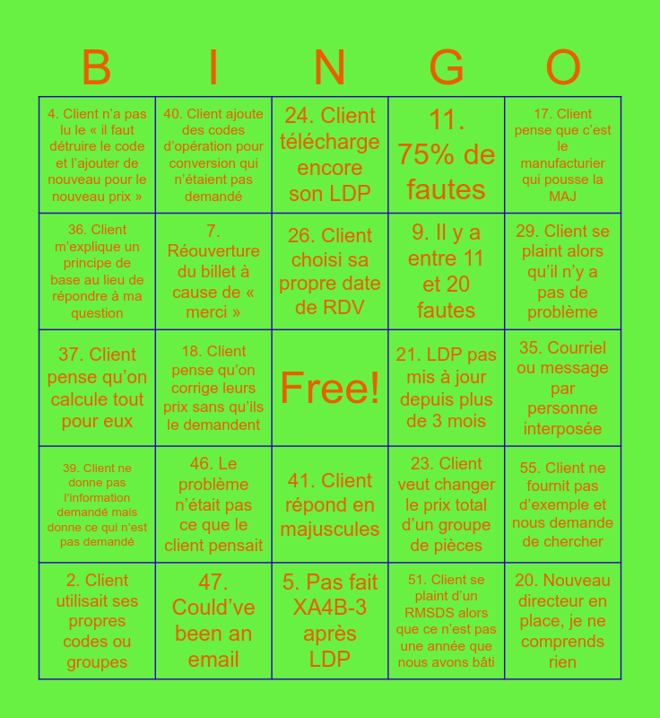This bingo card has a free space and 56 words: 1. Courriel répondu sans faire reply all, 2. Client utilisait ses propres codes ou groupes, 3. Courriel avec pas de bonjour et pas d’au revoir, 4. Client n’a pas lu le « il faut détruire le code et l’ajouter de nouveau pour le nouveau prix », 5. Pas fait XA4B-3 après LDP, 6. Ce n’est pas une question, 7. Réouverture du billet à cause de « merci », 8. Le client se réveille à Solution Provided, 9. Il y a entre 11 et 20 fautes, 10. Il y a plus de 20 fautes, 11. 75% de fautes, 12. Les seules fautes sont les S manquants, 13. Client envoie un courriel à l’adresse personnel, 14. Client appelle et laisse un MBV personnel, 15. Client change totalement le sujet/la demande d’un billet/courriel, 16. Client pense qu’on travaille étroitement avec le manufacturier, 17. Client pense que c’est le manufacturier qui pousse la MAJ, 18. Client pense qu’on corrige leurs prix sans qu’ils le demandent, 19. Client demande qu’on l’appelle sans donner de détail, 20. Nouveau directeur en place, je ne comprends rien, 21. LDP pas mis à jour depuis plus de 3 mois, 22. Client ne se présente pas à au RDV, 23. Client veut changer le prix total d’un groupe de pièces, 24. Client télécharge encore son LDP, 25. Client dit qu’il y a une erreur mais ça vient de lui, 26. Client choisi sa propre date de RDV, 27. Client veut détruire un morceau des RMSDS, 28. Combinaison de deux (laisse tomber les deux séparés), 29. Client se plaint alors qu’il n’y a pas de problème, 30. Client nous forward un courriel de l’interne sans rien écrire/ajouter, 31. Client pense qu’être en CC ça s’adresse à lui, 32. Client met « N/A » à une question de la checklist, 33. Demande une augmentation en pourcentage, 34. Demande des frais d’atelier en pourcentage dans les forfaits, 35. Courriel ou message par personne interposée, 36. Client m’explique un principe de base au lieu de répondre à ma question, 37. Client pense qu’on calcule tout pour eux, 38. Client dit que les RMSDS ne balancent pas, 39. Client ne donne pas l’information demandé mais donne ce qui n’est pas demandé, 40. Client ajoute des codes d’opération pour conversion qui n’étaient pas demandé, 41. Client répond en majuscules, 42. Le responsable d'un département ne se pointe pas parce qu'ils pensent que ce n'est pas utile, 43. Client envoie un courriel qui n’a aucun lien avec RMSDS ou LDP, 44. Client rajoute un courriel dans la chaîne sans mentionner c’est qui, 45. Client a fait une modification sans sauvegarder, 46. Le problème n’était pas ce que le client pensait, 47. Could’ve been an email, 48. Client détruit les pièces fictives RMSDS de son inventaire, 49. Client utilise le mauvais terme, 50. Client copie la même info dans tous les champs d’un billet, 51. Client se plaint d’un RMSDS alors que ce n’est pas une année que nous avons bâti, 52. Situation escaladée à CRM ou vendeur pour rien, 53. Client se contredit dans une même chaîne de courriel, 54. Client ne répond pas même après 3 courriels, 55. Client ne fournit pas d’exemple et nous demande de chercher and 56. Client met l’information importante dans le titre du courriel.