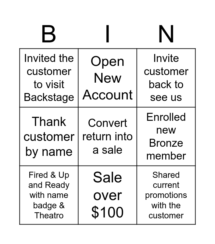 This bingo card has 14 words: Placed a Search & Send Order, Sought out & greeted customer, Fired & Up and Ready with name badge & Theatro, Open New Account, Thank customer by name, Convert return into a sale, Shared current promotions with the customer, Suggested & added extra item to the sale, Sale over $100, Invited the customer to visit Backstage, Offer to start a fitting room, Enrolled new Bronze member, Invite customer back to see us and Connected with customer in fitting room.