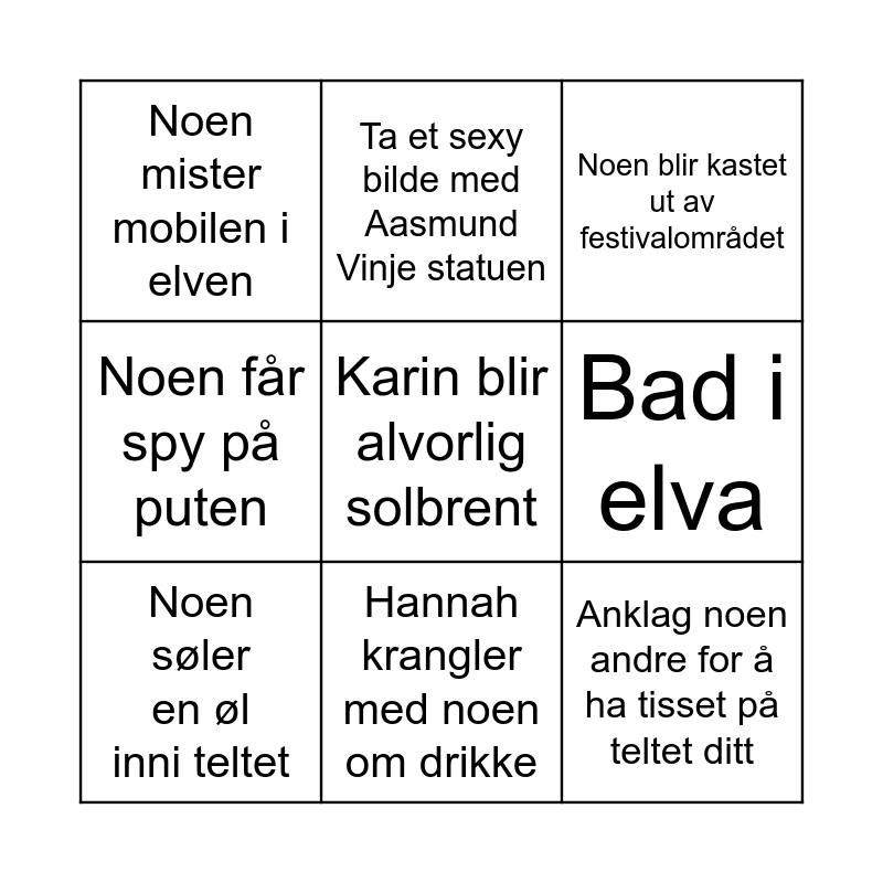 This bingo card has 41 words: Eirik kaster opp, Rezoan får vondt i magen, Sigurd ramler i en grøft, Noen søler en øl inni teltet, Noen har glemt powerbank, Johannes nekter for å være solbrent selv om han er det, Hannah krangler med noen om drikke, Noen tilbringer en natt i noen andres sovepose, Karin blir alvorlig solbrent, Ovar blir kjent med en utlending, Spot et flyvende partytelt, Noen får spy på puten, Noen har med seg alt for lite mat, Noen tibringer en hel natt utenfor sitt eget telt, Noen har med seg alt for mye mat, Noen glemmer sovepose, En av oss tryner i elven, Noen mister mobilen i elven, Noen går tom for strøm på moiblen, Noen blir kastet ut av festivalområdet, Noen glemmer å skaffe armbånd, Johannes får ytterligere utsettelse på masteren, Få tak i bacalao fra bacalao-campen, Anklag noen andre for å ha tisset på teltet ditt, Delta i rosévintoget, Noen kantrer med kayaken sin utilsiktet, Meld deg på en aktivitet, Bad i Bygdin, Bli med på Vinjerock sin Fjellbingo, Bli med på Vinjerock sin Quiz, Besøk Tuva i gjenbruksbutikken, Ta et sexy bilde med Aasmund Vinje statuen, Spander en pils på Aleks for å ha kriga som frivillig, Noen har en fremmed i sitt telt en natt, Gå på to fjelltopper, Bad i elva, Spill kort på innsiden av festivalområdet, Vinn ledertrøya, Gjør en utfordring i noen andres camp, Hopp over elva and Start en drikkelek.
