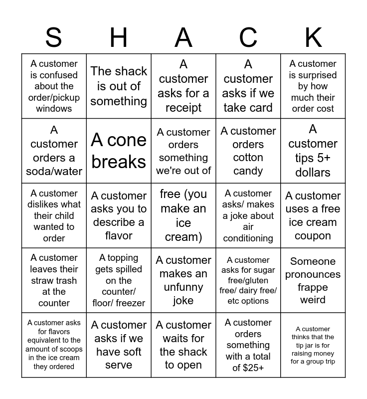 This bingo card has a free space and 45 words: The shack is out of something, A customer thinks that the tip jar is for raising money for a group trip, Someone left an angry note taped to a surface, A customer asks for flavors equivalent to the amount of scoops in the ice cream they ordered, A customer is intoxicated, A customer orders something with a total of $25+, A customer asks for a receipt, A customer asks for 1 or more sample(s), A customer is surprised by how much their order cost, A customer asks if we have soft serve, A customer asks if we take card, A customer asks/ makes a joke about air conditioning, A customer makes an unfunny joke, A topping gets spilled on the counter/ floor/ freezer, A customer comes over as soon as you try to leave, A customer waits for the shack to open, A customer comes within 5 minutes of closing, A customer dislikes what their child wanted to order, A customer empties all of their spare change into the tip jar, A customer tips 5+ dollars, The shack is out of something, A customer asks for a cup after getting their cone, A customer stares at you without talking as you make their ice cream, A customer is confused about the order/pickup windows, A customer asks for any kind of discount, A customer uses a free ice cream coupon, Someone parks in front of the shack/ no parking area, You run out of change while taking a customer's order, A customer asks for sugar free/gluten free/ dairy free/ etc options, A customer leaves their straw trash at the counter, The shack only has small gloves, Someone pronounces frappe weird, Someone pronounces sherbet/sorbet weird, A customer asks to order someone after they've paid, A customer asks about the barnyard, A customer asks you to describe a flavor, The freezer door falls into the freezer, A frappe explodes, A customer orders something we don't have on the menu, A customer orders something we're out of, A customer orders a soda/water, A customer orders cotton candy, Someone who works here comes for ice cream, A cone breaks and A scoop of ice cream falls into the freezer.