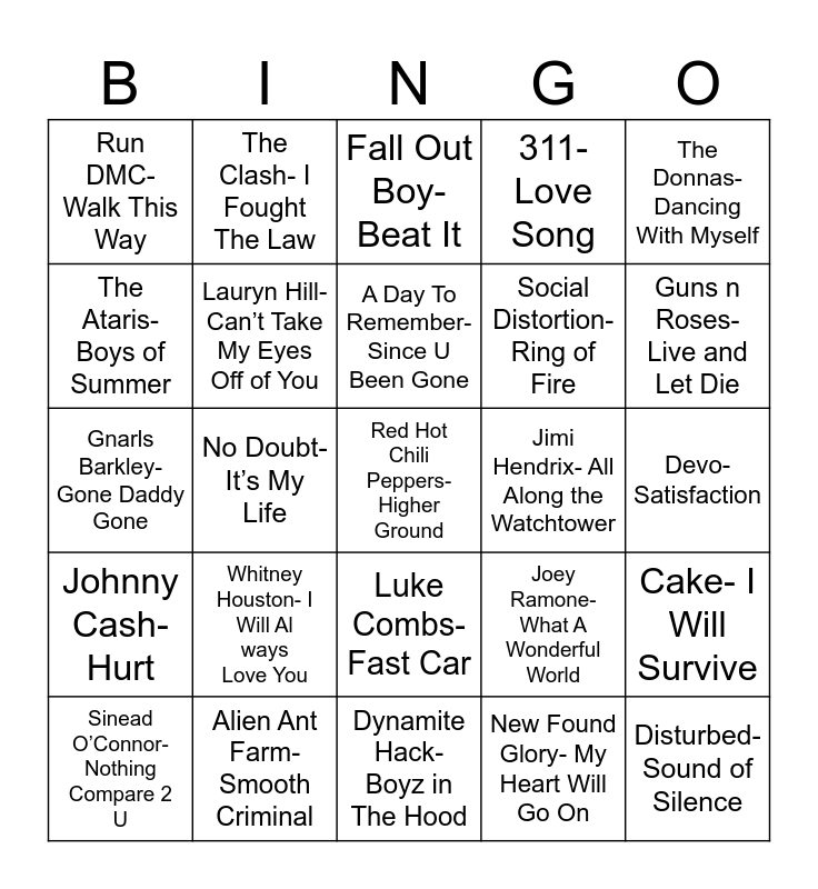 This bingo card has 28 words: Cake- I Will Survive, Goldfinger- 99 Red Ballons, Social Distortion- Ring of Fire, New Found Glory- My Heart Will Go On, The Ataris- Boys of Summer, Fall Out Boy- Beat It, The Clash- I Fought The Law, Johnny Cash- Hurt, Jimi Hendrix- All Along the Watchtower, Sinead O’Connor- Nothing Compare 2 U, Gnarls Barkley- Gone Daddy Gone, 311- Love Song, Alien Ant Farm- Smooth Criminal, Dynamite Hack- Boyz in The Hood, Guns n Roses- Live and Let Die, Soft Cell- Tainted Love, Whitney Houston- I Will Always Love You, Lauryn Hill- Can’t Take My Eyes Off of You, A Day To Remember- Since U Been Gone, Luke Combs- Fast Car, Run DMC- Walk This Way, Disturbed- Sound of Silence, Red Hot Chili Peppers- Higher Ground, No Doubt- It’s My Life, Devo- Satisfaction, Joey Ramone- What A Wonderful World, The Donnas- Dancing With Myself and The Dead Kennedys- Viva Las Vegas.