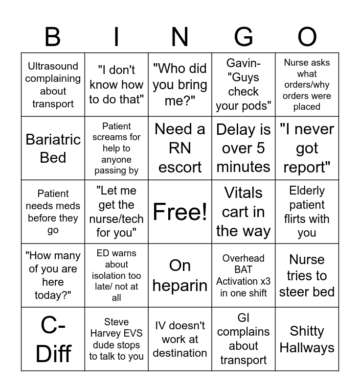 This bingo card has a free space and 39 words: "You got a license to drive this thing?", Patient refused transport, Bodily fluids touches you, Patient screams for help to anyone passing by, C-Diff, On heparin, Need a RN escort, Incorrect pocket phone # written on board, Nurse asks what orders/why orders were placed, "How many of you are here today?", "Let me get the nurse/tech for you", Gavin- "Guys check your pods", Shitty Hallways, Elderly patient flirts with you, Vitals cart in the way, ED warns about isolation too late/ not at all, Patient already taken, cancel call, Ultrasound complaining about transport, Blood Bank run, Overhead BAT Activation x3 in one shift, Bariatric Bed, IV doesn't work at destination, Delay is over 5 minutes, "I never got report", Patient has overprotective family members with them, Bed transfer, Clip a corner, Hit the patient arrival button, Bed bugs, "I don't know how to do that", Bed runs from PCU/2nd floor, We need wheelchairs, "Who did you bring me?", Steve Harvey EVS dude stops to talk to you, GI complains about transport, Stretcher runs from PACU, Nurse tries to steer bed, Patient needs meds before they go and Elevator breaks down.