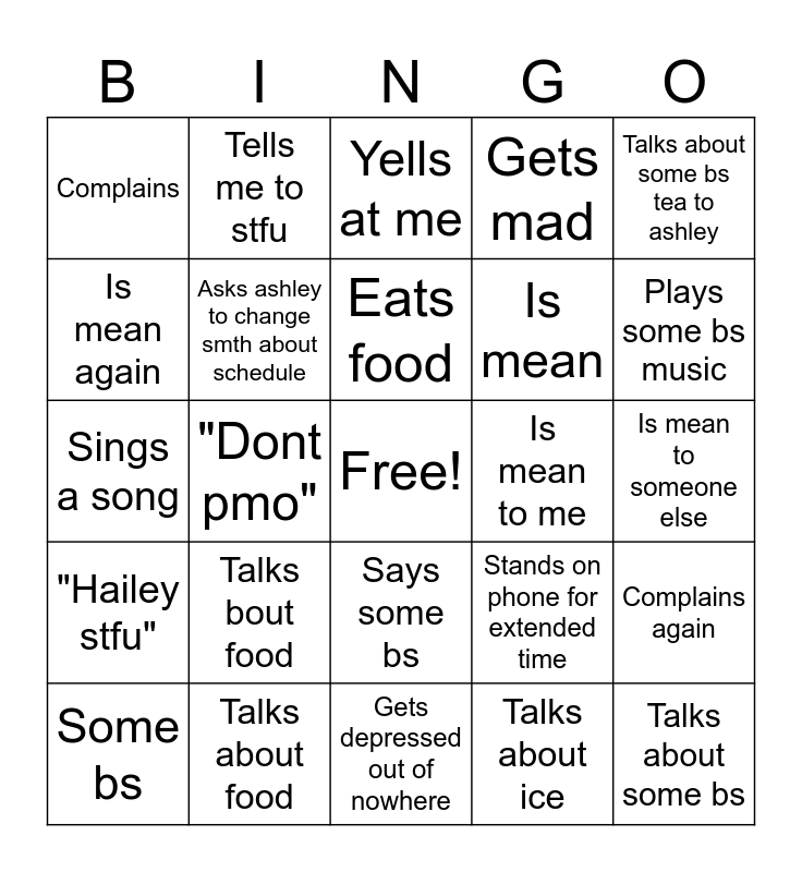 This bingo card has a free space and 24 words: Some bs, Talks bout food, Eats food, Talks about ice, Talks about some bs tea to ashley, Complains, Tells me to stfu, Yells at me, Is mean to me, Is mean to someone else, Sings a song, Asks ashley to change smth about schedule, Stands on phone for extended time, Complains again, Is mean again, Talks about food, Gets depressed out of nowhere, Gets mad, Plays some bs music, "Hailey stfu", "Dont pmo", Says some bs, Is mean and Talks about some bs.