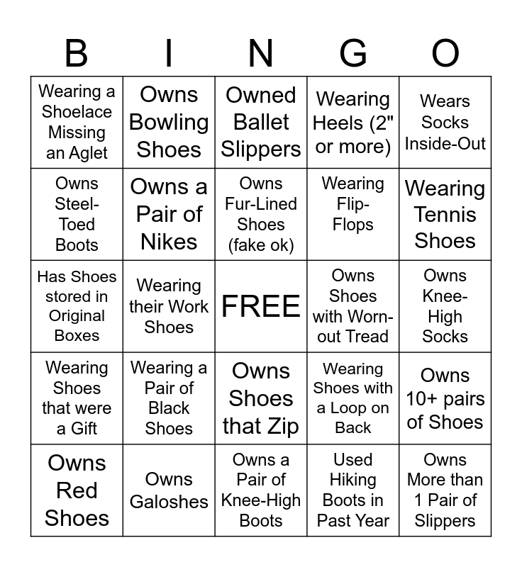 This bingo card has a free space and 39 words: Wearing Closed Shoes, no Socks, Owns shoes 5+ years old, Bought shoes in July, Owns a Pair of Nikes, Owns Red Shoes, Owns Shoes that Zip, Owns Fur-Lined Shoes (fake ok), Owns a Pair of Crocs, Wears Socks Inside-Out, Wearing Shoes that were a Gift, Wearing their Work Shoes, Wearing Heels (2" or more), Owns More than 1 Pair of Slippers, Owns Knee-High Socks, Owns Shoes with Worn-out Tread, Wearing a Pair of Black Shoes, Wearing Shoes that Close with Velcro, Wearing a Shoelace Missing an Aglet, Wearing Ankle Socks, Wearing Shoes with a Loop on Back, Owns Steel-Toed Boots, Owns a Pair of Knee-High Boots, Wearing Flip-Flops, Wearing Tennis Shoes, Wearing Boots (any style), Wearing Sandals (any style), Owns Garden Shoes, Owns Ice Tracks, Owned Ice skates, Owns Bowling Shoes, Used to own Oxfords, Owned Roller Skates, Owned Ballet Slippers, Owns Galoshes, Used Hiking Boots in Past Year, Owns More than 1 Pair of Snow Boots, Owns 10+ pairs of Shoes, Has Shoes stored in Original Boxes and Bought Shoes at a Thrift Shop in past year.