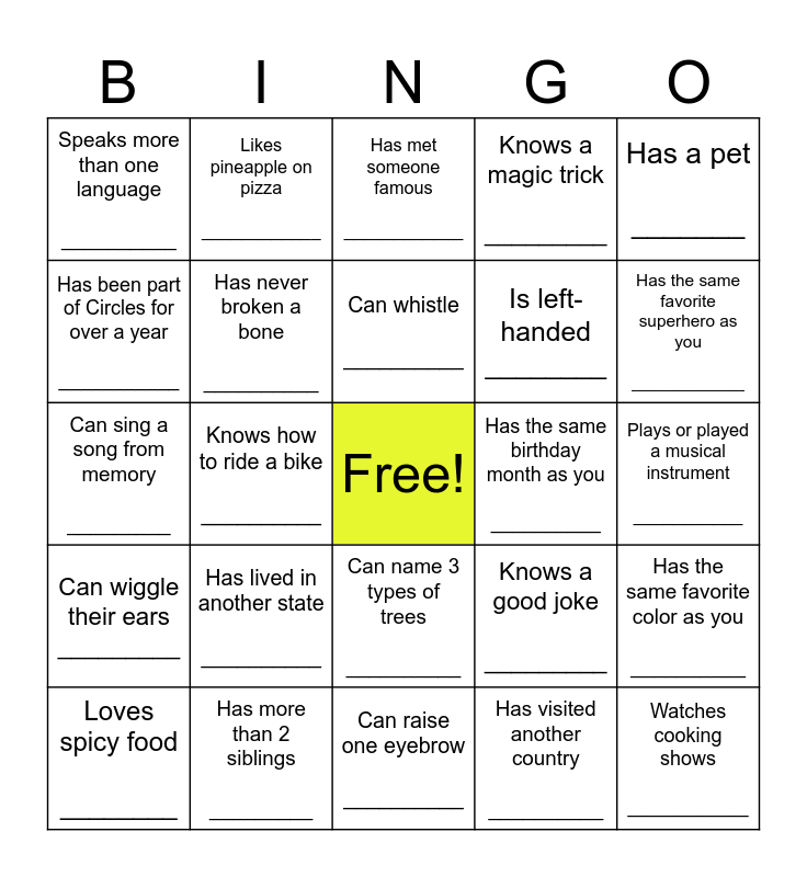 This bingo card has a free space and 24 words: Has lived in another state __________, Has more than 2 siblings _________, Can whistle __________, Loves spicy food ________, Has a pet _______, Speaks more than one language __________, Has been part of Circles for over a year ___________, Likes pineapple on pizza ____________, Has the same birthday month as you __________, Can name 3 types of trees __________, Is left-handed ________, Can sing a song from memory _________, Knows a good joke _________, Has the same favorite color as you __________, Has never broken a bone __________, Has visited another country __________, Plays or played a musical instrument ___________, Has met someone famous ____________, Has the same favorite superhero as you ____________, Knows how to ride a bike __________, Watches cooking shows ___________, Can wiggle their ears _________, Knows a magic trick _________ and Can raise one eyebrow __________.