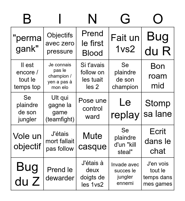 This bingo card has 25 words: J'étais mort fallait pas follow, J'étais à deux doigts de les 1vs2, Si t'avais follow on les tuait les 2, Bug du Z, Bug du R, "perma gank", Il est encore / tout le temps top, Objectifs avec zero pressure, Le replay, Mute casque, Se plaindre de son champion, Se plaindre de son jungler, Se plaindre d'un "kill steal", Ecrit dans le chat, Je connais pas le champion / yen a pas à mon elo, J'en vois tout le temps dans mes games, Stomp sa lane, Prend le first Blood, Bon roam mid, Ult qui gagne la game (teamfight), Pose une control ward, Prend le dewarder, Vole un objectif, Fait un 1vs2 and Invade avec succes le jungler ennemi.