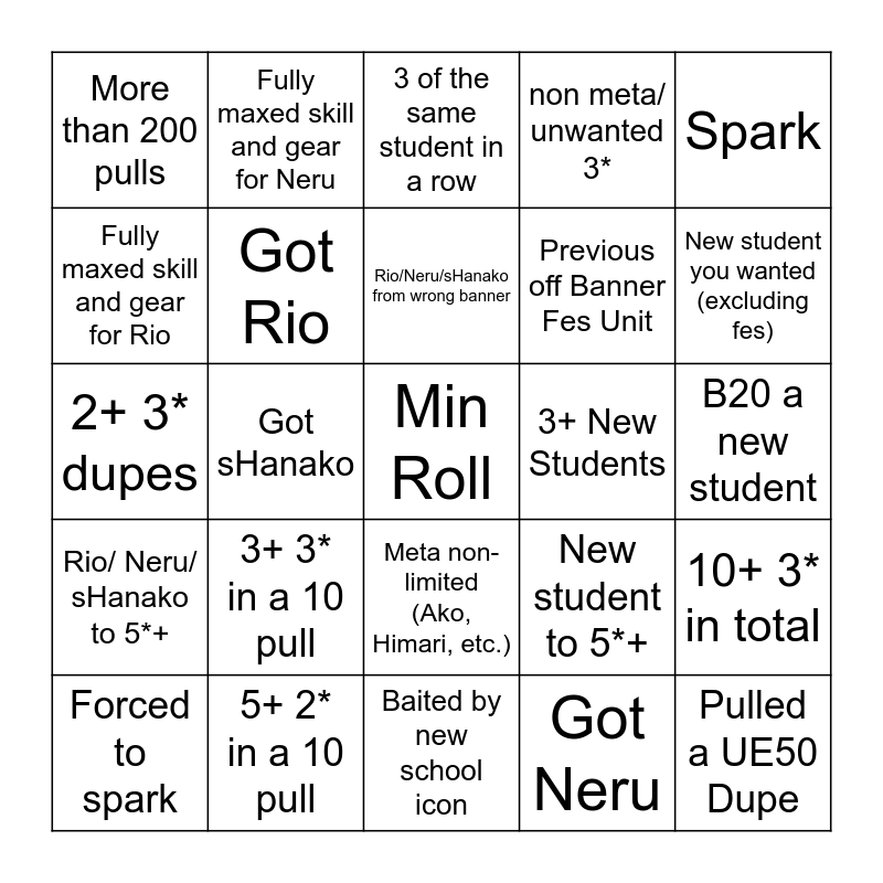 This bingo card has a free space and 24 words: 3+ 3* in a 10 pull, 5+ 2* in a 10 pull, Rio/Neru/sHanako from wrong banner, Forced to spark, Spark, More than 200 pulls, Fully maxed skill and gear for Rio, Fully maxed skill and gear for Neru, 3+ New Students, Meta non-limited (Ako, Himari, etc.), Previous off Banner Fes Unit, 2+ 3* dupes, New student to 5*+, 10+ 3* in total, Got Rio, Got Neru, B20 a new student, 3 of the same student in a row, New student you wanted (excluding fes), Got sHanako, Pulled a UE50 Dupe, Rio/ Neru/ sHanako to 5*+, non meta/ unwanted 3* and Baited by new school icon.