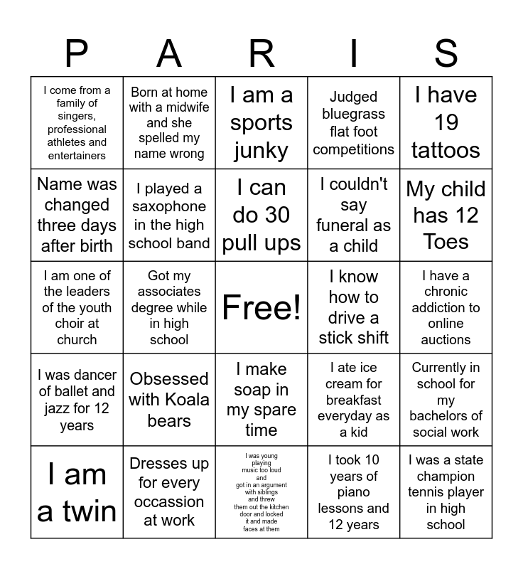 This bingo card has a free space and 24 words: Obsessed with Koala bears, Dresses up for every occassion at work, I can do 30 pull ups, I am a twin, I have 19 tattoos, I come from a family of singers, professional athletes and entertainers, Name was changed three days after birth, Born at home with a midwife and she spelled my name wrong, I know how to drive a stick shift, I make soap in my spare time, I couldn't say funeral as a child, I am one of the leaders of the youth choir at church, I ate ice cream for breakfast everyday as a kid, Currently in school for my bachelors of social work, I played a saxophone in the high school band, I took 10 years of piano lessons and 12 years, I have a chronic addiction to online auctions, I am a sports junky, My child has 12 Toes, Got my associates degree while in high school, I was a state champion tennis player in high school, I was dancer of ballet and jazz for 12 years, Judged bluegrass flat foot competitions and I was young playing music too loud and got in an argument with siblings and threw them out the kitchen door and locked it and made faces at them.