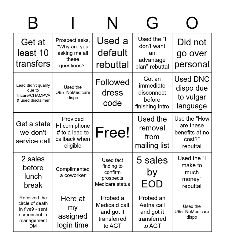 This bingo card has a free space and 24 words: Complimented a coworker, Here at my assigned login time, Followed dress code, Received the circle of death in five9 - sent screenshot in management DM, Did not go over personal, Get at least 10 transfers, Lead didn't qualify due to Tricare/CHAMPVA & used disclaimer, Prospect asks, "Why are you asking me all these questions?", Used the removal from mailing list, Used fact finding to confirm prospects Medicare status, Got an immediate disconnect before finishing intro, Get a state we don't service call, 5 sales by EOD, Used the "I make to much money" rebuttal, Used the O65_NoMedicare dispo, Probed an Aetna call and got it transferred to AGT, Use the "How are these benefits at no cost?" rebuttal, Used a default rebuttal, Used DNC dispo due to vulgar language, Provided HI.com phone # to a lead to callback when eligible, Used the U65_NoMedicare dispo, 2 sales before lunch break, Used the "I don't want an advantage plan" rebuttal and Probed a Medicaid call and got it transferred to AGT.