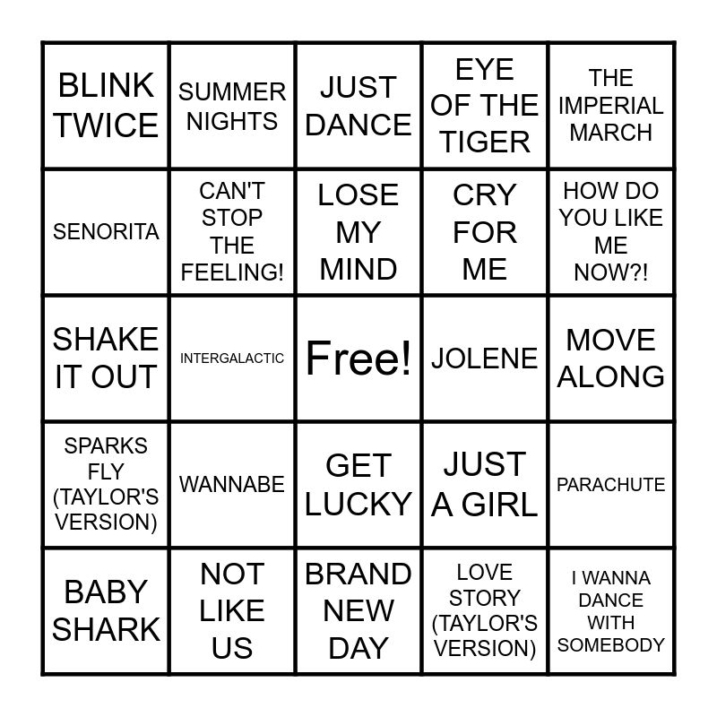 This bingo card has a free space and 55 words: AIN'T NO MOUNTAIN HIGH ENOUGH, BABY SHARK, BEST DAY OF MY LIFE, BLINK TWICE, BRAND NEW DAY, CALL ME MAYBE, CAN'T STOP THE FEELING!, COUNTRY GIRL (SHAKE IT FOR ME), CRY FOR ME, DANCING QUEEN, EYE OF THE TIGER, FANTASY, GETTIN' JIGGY WIT IT, GOOD LUCK, BABE!, HOLLABACK GIRL, ICE ICE BABY, THE IMPERIAL MARCH, INTERGALACTIC, IT AIN'T ME, I WANNA DANCE WITH SOMEBODY, JOLENE, JUMP, JUST A GIRL, JUST DANCE, JUST THE WAY YOU ARE, LOSE MY MIND, LOVE STORY (TAYLOR'S VERSION), MORE THAN A FEELING, MOVE ALONG, PARACHUTE, POKER FACE, RHYTHM NATION, RING OF FIRE, ROLLING IN THE DEEP, SENORITA, SHAKE IT OUT, SHATTERED (TURN THE CAR AROUND), SPARKS FLY (TAYLOR'S VERSION), STARVING, STAYIN' ALIVE, SUMMER NIGHTS, SUPERSTITION, TAKE A CHANCE ON ME, TEXAS HOLD'EM, WANNABE, NOT LIKE US, LAST NIGHT, GIRLS JUST WANNA HAVE FUN, UPTOWN FUNK, HOW DO YOU LIKE ME NOW?!, ATTENTION, ROCK YOUR BODY, YOU PROOF, GET LUCKY and COME AND GET YOUR LOVE.