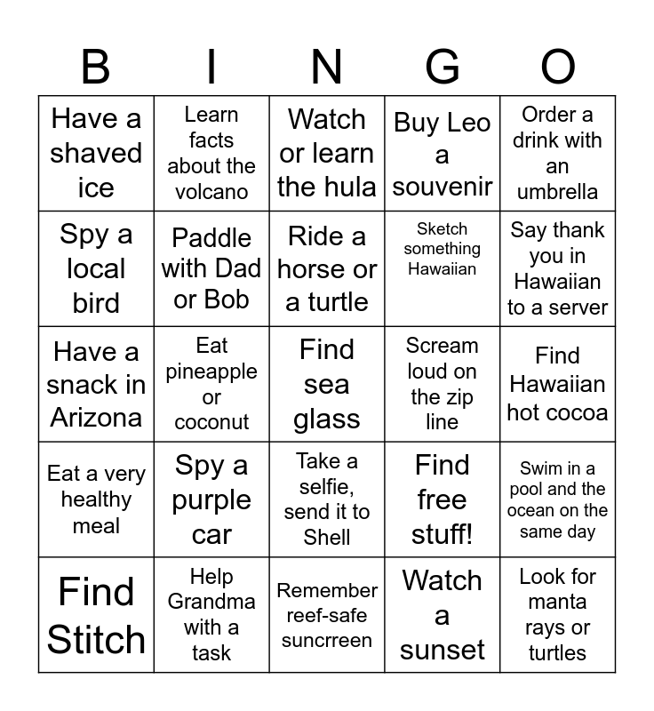 This bingo card has 25 words: Spy a purple car, Remember reef-safe suncrreen, Ride a horse or a turtle, Find Stitch, Order a drink with an umbrella, Have a shaved ice, Spy a local bird, Learn facts about the volcano, Scream loud on the zip line, Take a selfie, send it to Shell, Sketch something Hawaiian, Have a snack in Arizona, Find free stuff!, Swim in a pool and the ocean on the same day, Paddle with Dad or Bob, Look for manta rays or turtles, Find Hawaiian hot cocoa, Watch or learn the hula, Say thank you in Hawaiian to a server, Eat pineapple or coconut, Find sea glass, Help Grandma with a task, Eat a very healthy meal, Buy Leo a souvenir and Watch a sunset.